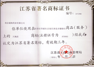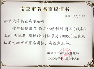 近日,康海药业主产品“注射用香菇多糖”的注册商标“天地欣”分别被江苏省及南京市工商管理部门授予“江苏省著名商标”和“南京市著名商标”称号。该称号的获得既标志着我公司该项产品在行业中的地位和技术水平,同时也为我公司该产品的知识产权保护方面增添了重要砝码。